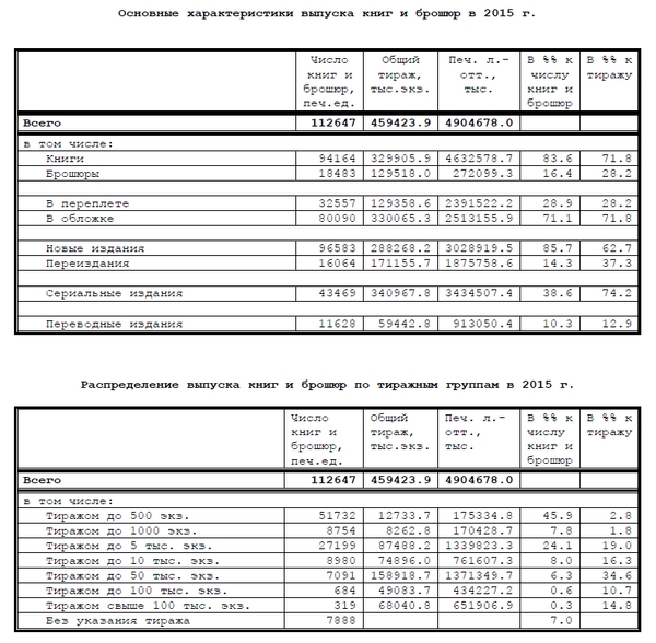 Тиражом свыше 100 тысяч экземпляров в 2015 году было издано всего 319 книг (в 2014 — 340), самой же многочисленной группой традиционно оказались книги и брошюры, напечатанные тиражом до 500 экземпляров — в эту группу вошли свыше 51,7 тысячи изданий.